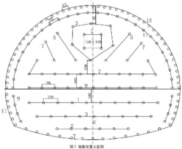 炮孔布置是钻孔爆破技术在水利水电工程施工过程中重要环节,也是保证爆破质量的基础,在进行隧洞钻孔爆破技术应用过程中,要结合实际施工情况,合理地布置炮孔,并要保证炮孔数量、钻孔深度以及炸药单耗等相关参数满足施工标准和要求。首先,在进行炮孔布置时,要注意孔间距和排距,合理布置孔距和排距可以有效地提高爆破效果;其次,要保证炮孔深度满足施工要求,这是因为钻孔深度和炮孔深度都会直接影响爆破效果,在实际施工过程中,要保证钻孔深度满足相关标准和要求,避免超深情况出现,在进行炮孔布置时,还要根据地质情况、隧洞断面形状、隧洞走向等因素来确定爆破参数,如图1。在实际施工过程中,要根据隧洞断面形状、围岩等级等因素来选择合理的装药量,此外,还要注意炮孔布置时要保证爆破质量。在进行钻孔爆破施工时,要保证所有炮孔位置、角度以及深度都符合设计标准和要求,这样才能够有效地保证爆破质量,此外,还要对炸药单耗进行合理控制。