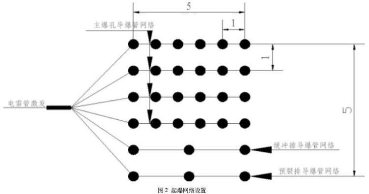 在进行爆破设计时,要考虑到围岩硬度、岩石结构以及相关地质条件等,保证能够实现安全和高效施工,对于爆破设计而言,首先要对现场岩石状况进行勘察,对于一些可能出现坍塌等问题岩层要进行重点处理,保证能够避免因为坍塌而导致的安全问题。在具体的设计中,需要合理确定药量,在进行设计时,要充分考虑到钻爆参数和围岩条件等因素,为了能够保证爆破效果,需要对施工方案进行详细分析,根据相关数据统计显示,当爆破网络中包括6个药包时,爆破效果最好;当爆破网络中包括8个药包时,其总的爆破效果最差;当爆破网络中包括10个药包时,其总的爆破效果最差。在进行施工过程中,需要结合工程实际情况选择合理的施工方案,例如,在隧洞开挖过程中,通常情况下是采用电雷管作为起爆网络,在对其进行施工设计时,需要根据实际情况确定具体施工方案和起爆网络设置,在实际施工过程中,要做好起爆网络和周边环境保护工作,对于周边环境而言,通常情况下是指隧道周围建筑物、设施等情况,在进行光面爆破时需要合理选择相关参数,确定炸药单耗和孔底允许装药量等指标[3]。如图2: