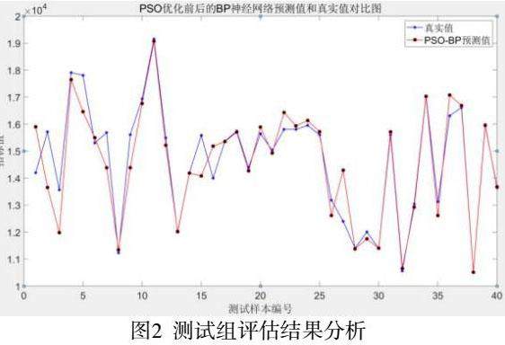 图2是测试组40组样本数据的二手房价格PSO-BP模型预测值与二手房市场价格的对比。从图中可以看出,大部分测试组预测值点与真实值点接近重合或距离较小,证明模型在测试组的二手房价格预测中表现优秀。