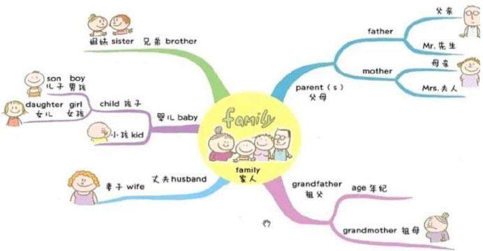 例如在“Family”单元教学中,教师可以利用思维导图将家庭成员、家庭活动、家庭特点等相关内容进行分类和梳理。这样一来,学生就能够清晰地了解每个知识点的内在联系,并形成一种整体的认知框架,有助于加深学生对家庭的理解。同时,思维导图还可以促进学生的思维发展,通过思维导图的构建,学生需要将不同的知识点进行整合和归纳,这就要求学生进行概括、分类、比较等思维活动。这种思维过程能够帮助学生建立起一种批判性思维和创造性思维的意识,培养学生的分析和综合能力。同时,思维导图的视觉化特点也能够激发学生的联想和想象力,让学生更加主动地探索知识的深层含义。另外,将思维导图融入初中英语教学还有助于提高学生的学习兴趣和参与度。相比于传统的教学方式,思维导图给学习带来了一种新颖的体验。学生可以参与到思维导图的构建过程中,用自己的方式将知识点加入其中,这种参与感能够增强学生的学习动力。思维导图如下所示: