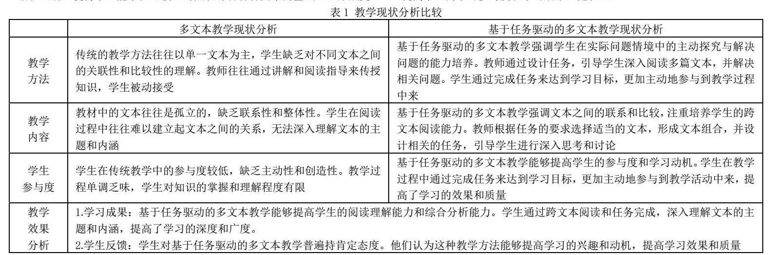 基于任务驱动的多文本教学相比传统教学方法具有明显的优势,能够提高学生的学习参与度和学习效果,见表1。