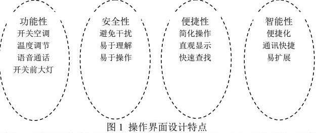 基于智能化、网络化等升级改造需求,工程车司控台操作界面设计的特点可以归纳为功能性、安全性、便捷性和智能性等四个方面,如图1所示: