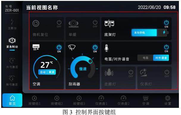 在本设计中,操作界面的功能包括:(1)标题区域显示内容至少包括时间、当前界面名称、车号等主要信息。(2)内容区域固定区域显示安全相关或常用按钮。(3)活动区域根据菜单选择切换到对应界面显示。活动区域包括但不限于下一元素显示:如按钮、仪表盘、其他组合元素等。活动区域元素显示每个按钮元素组件,需要显示的内容包括按钮名称,实际状态(如开、关)、每个模式名称(如有)等。(4)旋钮/转换开关的显示切换到对应模式时,该模式的名称需要高亮显示,未被选中的模式为常规/灰色显示。如图2所示。