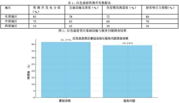 在基于红色旅游资源的思政教育模式实践中,资源开发不充分且缺乏区域特色这一问题表现在多个层面。第一,全国不同地区的红色旅游资源禀赋存在显著的地域差异,导致开发程度不均衡。根据相关数据,东部和中部地区,如北京、湖南、江西等省份,红色文化资源开发较为丰富,而西部地区如新疆、青海、西藏等地,红色资源相对匮乏。这种不均衡的资源分布导致部分地区在红色旅游的开发上没有形成具有特色的开发模式,难以吸引游客。第二,资源的开发往往停留在表面,缺乏深层次的文化挖掘和区域特色融合。在很多景区,资源的展示方式主要依赖于静态的文物展示和单一的讲解模式,未能结合当地历史文化和风俗习惯进行深度开发,导致红色旅游的教育价值未能得到充分体现[4]。第三,在基础设施方面,许多红色旅游景区的交通、住宿、餐饮等配套设施不够完善,尤其是在偏远地区,游客的可达性较差,直接影响了红色旅游的吸引力。根据调查数据显示,41.77%的游客认为红色旅游景区的基础设施有待改善,39.24%的游客对景区的餐饮和住宿条件不满意。这种基础设施的薄弱限制了景区接待能力和服务水平,进而影响了整体的旅游体验。第四,在跨区域合作方面,很多革命根据地和长征路线等跨省市的红色旅游资源开发进展缓慢,区域之间缺乏有效的合作机制。这导致了一些重要的红色旅游资源被割裂,未能形成一个有机的整体开发体系。例如,鄂豫皖革命老区涉及多个省份,但由于开发规划不统一,各地的开发水平参差不齐,资源无法形成有效互补,整体开发效率不高。第五,资金的投入不足是制约资源开发的一个重要因素。尤其是在西部和经济欠发达地区,地方财政有限,红色资源开发项目的资金不足,导致很多革命遗址和历史文物缺乏有效保护和修缮,无法达到红色旅游应有的文化教育功能。为了直观展示存在的资源开发不充分,缺乏区域特色的问题,下面通过表1和图1进行展示。