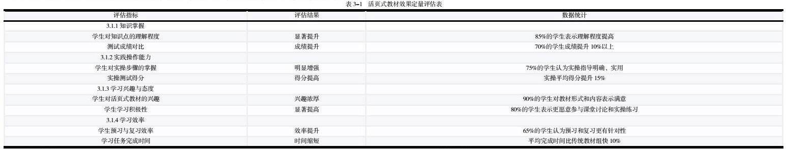 在综合实训结束后,为了客观、全面地评估活页式教材的应用效果,我们采用了定量和定性两种评估方法,并与传统教材进行了对比分析,方法如下。