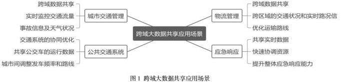 跨域大数据共享在现代社会的多个领域展现出巨大的应用潜力,特别是在智慧交通建设中。1)城市交通管理中,通过跨域数据共享,实时监控交通流量、事故信息及天气状况。例如,城市交通管理中心与气象部门共享实时气象数据,预测恶劣天气对交通的影响,提前采取措施,减少交通拥堵和事故的发生[3]。2)在公共交通系统中,跨域数据共享可帮助不同城市间的交通系统进行协同优化。通过共享公交车的运行数据,城市间调整发车频率和路线,确保在高峰时段有效分流乘客,提高公共交通的使用效率。同时,乘客也能通过手机应用获取不同城市间的实时公交信息,提升出行体验。3)物流管理。促进跨域数据共享,物流公司获取跨区域的交通状况和实时路况信息,从而优化运输路线、提高配送效率。这种信息共享不仅降低运输成本,还能提高客户满意度。例如,某物流公司通过与交通管理部门合作,实时获取交通拥堵信息,及时调整配送路径,成功避免了因交通堵塞导致的延误[4]。4)在应急响应领域,跨域数据共享显得尤为重要。在自然灾害或重大事件发生时,各区域之间通过共享实时数据,可以更快速地协调资源。例如,在发生洪水灾害时,不同地区的应急管理部门可以共享水位监测数据、救援资源和人员调度信息,提升整体应急响应能力,最大限度地减少人员伤亡和财产损失。跨域大数据共享应用场景如图1所示: