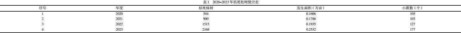 根据往年松材线虫病害调查数据,2020年发生枯死松树544株,涉及105个小班,面积0.1606万亩;2021年发生枯死松树900株,涉及103个小班,面积0.1786万亩;2022年发生枯死松树1515株,涉及127个小班,面积0.1935万亩;2023发生枯死松树2168株,涉及177个小班,面积0.2532万亩。松材线虫病疫情发生的小班和面积增加缓慢,但枯死松树量增加明显,这也表明目前霞坑镇松材线虫病疫情扩散不严重,但防控形式严峻。