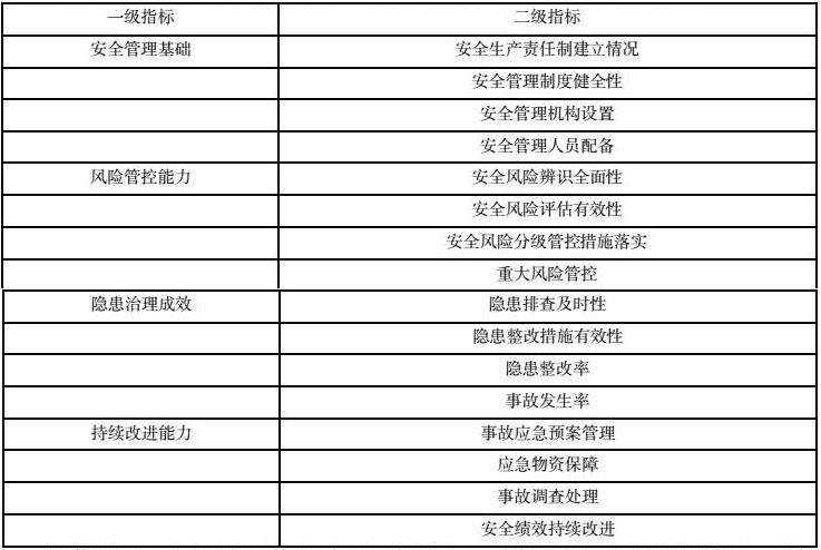 一级指标下设二级指标,综合考虑定量指标和定性指标,定量指标侧重结果导向,直观量化企业安全管理成效,如可计算事故发生率、安全培训覆盖率、整改率等;定性指标侧重过程管理,评价企业安全制度建设、风险研判、隐患排查等过程管控情况,如制度健全性、风险辨识全面性等,具体指标设置如下: