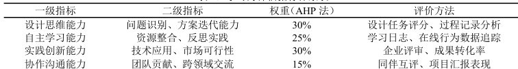 将学习力目标分解为准则层(四大维度)与方案层(具体指标),通过专家打分(10 名设计教育专家与企业代表)构建判断矩阵,计算得出各维度权重(如表1)。