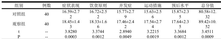 老年2 型糖尿病80 例患者均收录于2024.5——2025.5 期间,实施摸球法将样本等分为两组(40 例/组),组别名称对照组【22 例男性和18 例女性;年龄阈值40-75 岁,均值(52.70±3.57)岁】、观察组【21 例男性和19例女性;年龄阈值40-78 岁,均值(53.25±4.33)岁】。两组基线资料均衡,