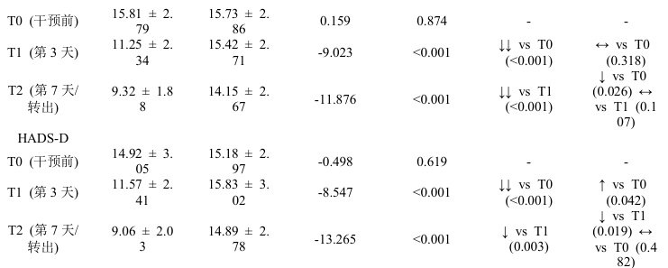 表1:两组患者不同时间点HADS-A、HADS-D 评分比较