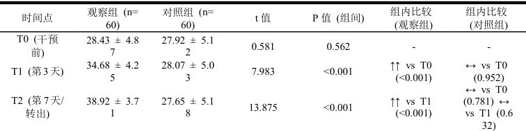 ②观察组:在常规护理基础上,实施基于Snyder 希望理论的整合护理干预,由经过专项培训的护理人员执行,每日1-2 次,每次约20-30 分钟,持续至转出ICU 或满7 天。