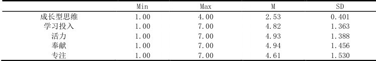 成长型思维量表:本研究采用 Dweck 等人编制、家晓余老师修订的思维模式量表中文版[1]。共计 20 个项目,包含成长型思维和固定型思维2 个维度。其中第 1、4、7、8、11、12、15、16、17、20 题反向计分。从1(非常不同意)到 4(非常同意)。得分越高,表示成长型思维水平越高。总量表的α系数是 0.794,分量表的α系数是 0.765、0.715。