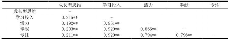 1. 小学生成长型思维与学习投入呈显著正相关关系,可以认为小学生成长型思维程度越高,学习投入程度越高。成长型思维与活力、奉献和专注三个维度呈显著正相关关系。