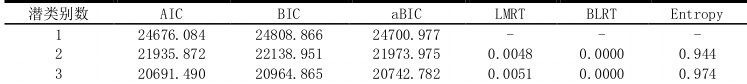 个体为中心的方法能够将具有相似性作答反应模式的个体划分为同一类别,以达到不同类别间差异最大,类别内差异最小的效果。潜在剖面分析的参考指标主要包括Log Likelihood、AIC、BIC、aBIC、和信息熵(Entropy)。LMRT 和 BLRT 是似然比检验指标。