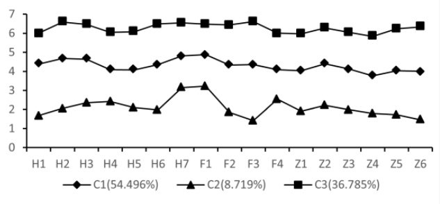 从图 1 可以看出,小学生学习投入的类型分为 3 种:高投入(C3,36.785%)、中等投入(C1,54.496%)、低投入(C2,8.729%)。高投入的小学生的量表各项得分均在6 和7 之间,中等投入的小学生的量表各项得分均在4 和5 之间,低投入的小学生的量表各项得分在1 和3 之间。