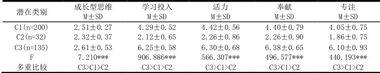 结合图1 和表5,三个潜在类别在成长型思维、学习投入、活力、奉献和专注五个维度上的均值具有显著差异,表现出不一样的特点。C2 类别的小学生在各个维度上的得分低于另外两种类别,故将C2 命名为低学习投入型;C1 类别的小学生在各个维度上的得分居于C2 和C3 类别之间,故将 C1 命名为中等学习投入型;C3 类别的小学生在各个维度上的得分高于C1 和C2,故将C3 命名为高学习投入型。