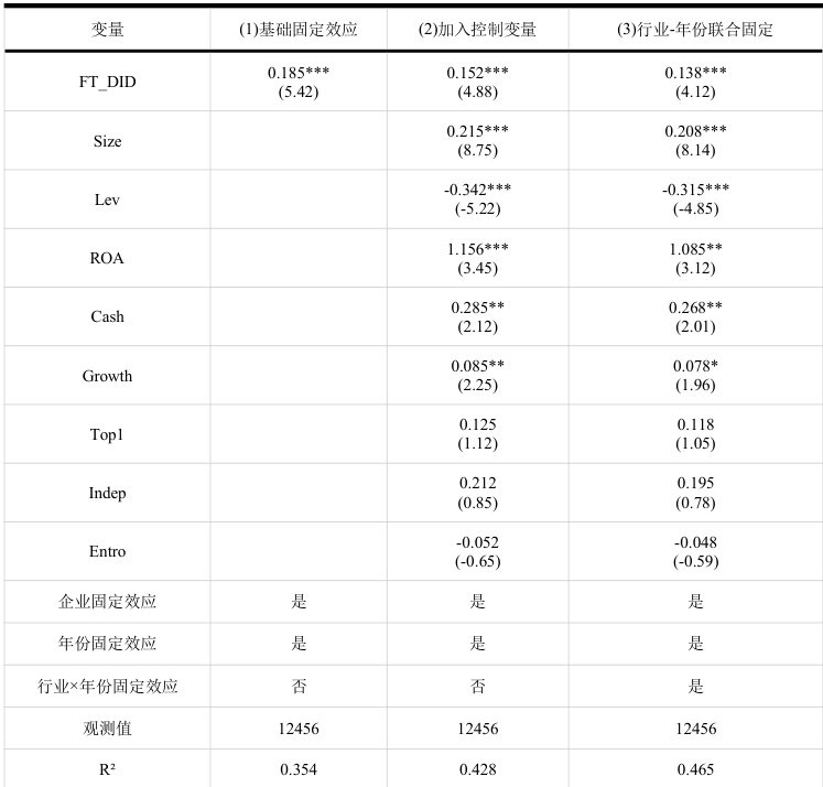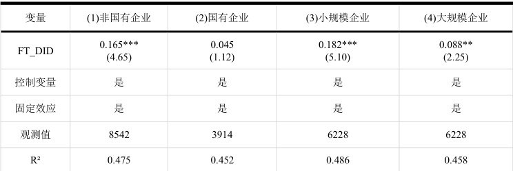 第一,PSM-DID检验。为缓解试点城市与非试点城市企业的初始禀赋差异带来的自选择偏误,采用倾向得分匹配法,以所有控制变量为协变量,通过1:1最近邻四 配特征相近的控制组企业,匹配后样本通过了平衡性检验,组间系统性差异已消除。基于匹配 日,FT_DID的系数为0.134,在1%水平上显著为正,与基准结果基本一致。