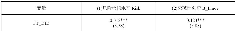 第四,剔除特殊样本。考虑到直辖市与深圳等超一线城市的金融资源与创新资源高度集中,可能夸大政策效应,剔除四个直辖市与深圳的企业样本后重新回归,FT_DID的系数仍在1%水平上显著为正,基准结论保持稳定。