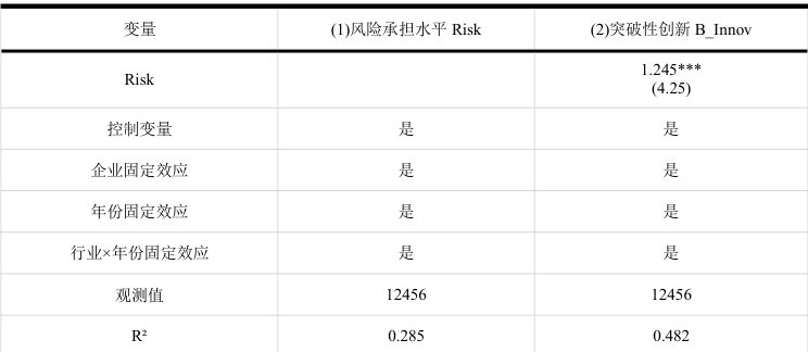 中介效应检验逻辑如下:首先检验基准模型中 β1 的显著性;其次检验 β2 ,若金融科技对风险承担水平的系数显著为正,说明金融科技可显著提升企业风险承担水平;最后检验 β3⋅β4 ,若两者均显著为正,β3∗β1 有所下降,说明风险承担水平发挥部分中介作用;若 β3 不显著、 β4 显著,说明风险承担水平发挥完全中介作用。