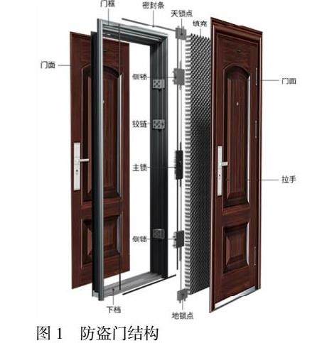如图1所示,常见的家用防盗门主要结构包括门框、铰链(合页)、门面、填充材料、主锁体、侧边锁及天地锁系统、拉手等部分。