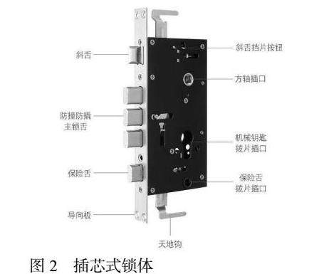 根据GA/T 73-2015《机械防盗锁》中对机械防盗锁的定义[3],机械防盗锁具有以下特征:一是通过机械传动装置控制锁具启闭,二是具有防钻、防锯、防撬、防拉、防冲击、防技术开启功能。按照锁体结构,机械防盗锁可以分为插芯式锁体、外装式锁体和密码式锁体,其中,插芯式锁体和外装是锁体常用于防盗门。