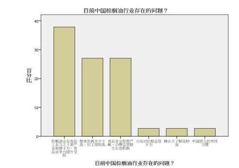 调查总样本37人,男13人,女24人,样本人员均来自中国,有31人为学生,6人为社会其他人员,经过调查发现棕榈油行业受企业食品工业与上下游产业衔接不力,食品竞争力提升受限的影响是最高的,占调查的所有影响情况的37%;影响其次的是整体发展水平不高,加工度较低以及食品安全形势严峻,治理监管缺乏长效机制,分别占比27%;然而市场对价格监管不力,确实不了解这种油以及中国悠久的烹饪习惯的受影响情况在调查中占比总共不超过10%。调查分析中发现大部分人不知道棕榈油,也不知道市场上大部分的调和油的成分是棕榈油,占比高达调查人数的9成,这也是影响国内人们对棕榈油使用最重要的因素,不过还是有一部分的人清楚中国的棕榈油主要是通过国外进口,但是具体来源是哪些国家并不清楚,在普及了解了棕榈油后大部分人是很愿意购买的。