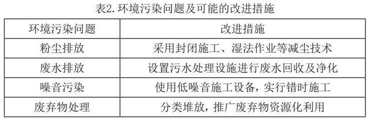 在推进基于绿色施工理念的建筑项目过程中,施工过程的环境污染问题频繁成为技术和管理上的难题[2]。尘土飞扬、噪音震天、废水排放和垃圾堆放等问题仍旧普遍存在,这些因素严重违背了绿色施工所倡导的环保理念。施工活动中产生的粉尘和废水如果未经妥善处理,会对周围的空气和水质造成污染。同时,机械设备的运行和施工作业所产生的噪音,往往会对周边居民的生活造成干扰。针对这些问题的解决,需从技术创新、施工方案优化以及管控制度建立等多方面入手。表2概述了几种常见的环境污染问题及可能的改进措施: