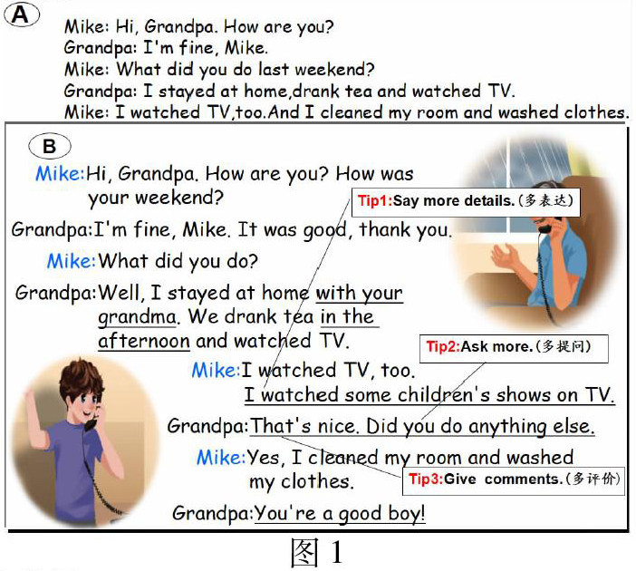 例如: 在教学Lesson 6 Make a call 时, 笔者提炼了Mike和grandpa的活动后,让学生运用关键词组织最简短的对话,如图对话A; 然后让学生观察对话A和教材中的对话(对话B)哪个更好,并说说理由。还请学生指出对话中运用了哪些语言使对话更丰富。之后,教师给出以下三条微策略,引导学生自主构建对话(如图1)。