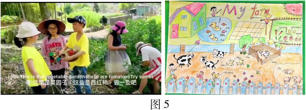 本节课结束,我还给学生布置了一个创意性的作业:请同学们亲自去周围的农场拍摄照片或小视频描述农场,以及学生自己来画一画农场进行描述。下面是几位学生的homework作品(如图5):