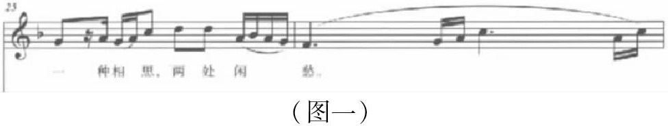 本曲一字多音也是全曲的重点之一。例图一,本句的25小节休止符要做到声断气不断;26小节需要把控唤气口,既要保证句意的完整性,还要考虑情感的流动性,本句换气口应在5 6 1后面,6 1 与后面一句连接,气息不能随着音高的变化而提起到胸口,会导致声音紧张。