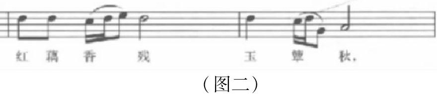 作品第一句“红藕-相残,玉-簟秋”(见图二),起音落在“re”上,“hong”本应当有字头,但刻意加字头会唱出倚音,这时候“h”韵母一出,马上归“ang”韵;“ou”直接在“hong”基础上落音不需要变换嘴型;“xiang”字是一字多音,在演唱时不能变换歌唱位置,同时要唱连贯,并且“x”字头声母,“i”字腹韵母,“ang”字尾韵母,这三个部分“xi”落在“1”上,“ang”落在“2、3”上归韵,“can”唱完“c”要迅速将韵母收到软腭上;“yu”直接吸气,在前一个音的位置上保持,“dian”字一字多音音区跨度较大,唱时从“di”过渡到“yan”再归韵到“an”,归韵过程中由于音区跨度较大,在咬字过程中发声位置不能掉,在软腭上轻轻画圈将“an”挂在软腭上。