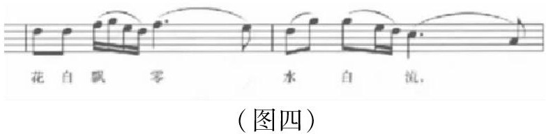 歌曲23小节在22小节的伴奏推动中情绪高涨,在咬字中切不可咬紧,一句话要在保持口型打开中咬字。“hua”需将字头“h”抓住唱清楚,不然听众很容易听成“a”或者“gua”;“zi“是齐齿音,用力在齿,不能过度用力,会造成牙关紧,做不到声音饱满;“piao”一字四音,“ao”韵不好保持,需要我们读歌词体会发音位置,自然归韵;“ling”字要从“li”舌头轻轻弹门牙内部,将齐齿音过渡到“ng”软腭上;“shui”这时有个四度的跨度,而这个字本身不好唱,要抬笑肌唱,力量在大牙上,轻轻咬住,“shu”到“ei”只需要抬一下大牙,让“ei”贴着软腭发音即可。