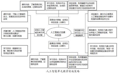 (三)基于“人工智能”学科核心概念的单元教学实施策略,要根据单元整体教学设计、围绕单元主题问题及学习活动,综合各学科知识,设计以学生为中心的单元项目、课时子项目及项目学习活动等教学实施流程与教学实践,并形成校本化的人工智能课程单元教学实施策略。