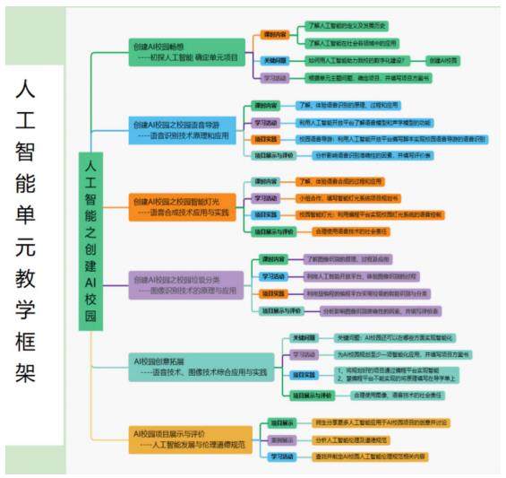 (二)基于“人工智能”核心概念的单元整体教学设计,要经过确定单元教学目标,设置单元主题任务,设计与分解单元教学活动、开展单元教学评价等一系列教学设计流程,并形成校本化的人工智能课程单元整体教学设计框架。