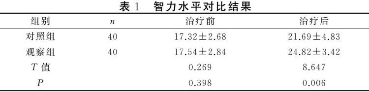 治疗后,对照组患者智力水平评分为21.69±4.83,观察组患者智力水平评分为24.82±3.42,观察组高于对照组,两组数据差异显著(P<0.05),具有统计学意义,如表1所示。