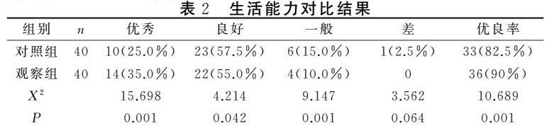 治疗后,对照组患者生活能力优良率为82.5%,观察组患者生活能力优良率为90.0%,观察组高于对照组,两组数据差异显著(P<0.05),具有统计学意义,如表2所示。