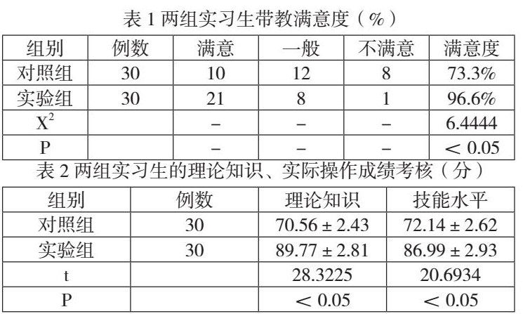 分析数据如表1,带教满意度评估实验组高于对照组,P<0.05。