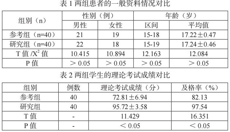 研究组学生的理论考试成绩比参考组学生高20分左右,及格率比参考组学生高15%左右,p<0.05,组间数据对比有统计学差异。