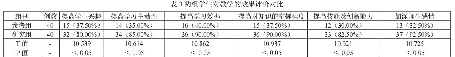 研究组学生对于教学效果的认可度、评价要远高于参考组学生,p<0.05,组间数据对比有统计学差异。