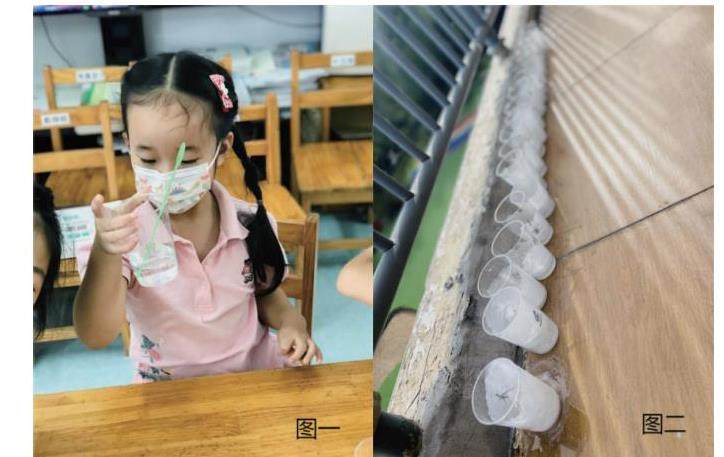 溶解现象是孩子们生活中经常遇到的,并通过做“糖哪去了”“盐不见了”等实验,充分理解了溶解的概念。但是与之相对的“饱和”现象孩子们还并不了解。于是,老师抓住孩子早上入园喝淡盐水漱口时,经常讨论盐水“咸一点”、“淡一点”这样的时机,带着孩子一起做饱和的实验。材料是水杯、水、搅拌棒和盐。首先,老师让孩子们尝试在半杯水里一点点地放入盐。通过实验孩子们发现,当盐加到一定量之后,就无法继续溶解(图一),“老师,我加的盐不溶解了,都在杯底。”“我的也不溶解了”“可能搅拌的力量不够吧”“怎么搅拌这些盐就是不溶解了呢”......这时老师很有指导策略地引导:“小朋友们想象一下,我们吃饭的时候会吃饱,就不想继续吃了,因为我们小肚子已经装满,装不下了”。孩子们立刻明白了:“水也是这样,水也吃饱盐了”、“水也吃不下那么多盐,所以多出来的盐,水不想吃”......这时候,孩子们完全理解了“饱和”这一现象,老师这时才告诉孩子们这种现象就叫做“饱和”。然后,老师又提示孩子们“把水杯里的水加满会怎么样”?结果是把半杯水加满后经过搅拌原来饱和的盐又溶解了,于是孩子们知道了水越多能溶解的盐就越多。后来,在老师的引导提示下,怎么把盐变回来呢?孩子们又把盐水杯拿到阳台上去晒,让太阳把水晒干看看盐能不能出来(图二)。孩子们每天去观察,每天水位都会下降一点,于是孩子们又理解了“蒸发”的概念。有趣的是,过几天盐真的被晒就出来了。孩子们一起观察实验结果,惊喜的发现,有的孩子的盐杯里晒出盐完美的结晶,在阳光下照射下,晶莹透亮,可以清楚地看到不同的形状。于是孩子们又初步了解了“结晶”是什么,这真是意外的收获。