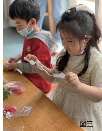 实验一:针管里的大力士。材料很简单,两条针管连着一段胶管、与针管直径相同的泡沫球。首先让孩子们把一支针管的塞子拔出一半,然后把另一端用手紧紧地堵住再推塞子。孩子们当然是推不动塞子的,力量大的男孩子也推不动。那就把塞子拔出来吧,同样也拔不动,孩子们感受到了一股力量。然后让孩子把两条针管连起来尝试,两边的塞子同时往中间推还是推不动,但是相互推能推动,只是中间总是空着一段距离,两个塞子不能靠近(图三)。这个力量就是来源于这段空气,孩子们感叹:空气的力量可真大。但是孩子们发现只要有一端漏一点空隙,这个力量就没有了,于是孩子们总结出了秘密:就是在“封闭”的空间里,空气有力量。那到底这个力量有多大呢?老师让孩子们把连着的两支针管其中一端的塞子拔掉,然后把泡沫球堵在针管里面,鼓励孩子们想一想怎么让小球出来呢?孩子们立刻想到了,还相互交流“别漏气”“用小球堵严”。然后推动另一端的塞子,小球“砰”的一声弹出老高。孩子们玩的不亦乐乎,不停地说“我的空气力量大”,“我的空气力量更大”。