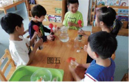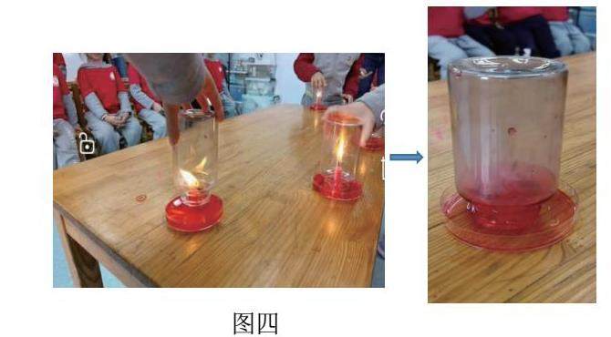 实验二:水钻到瓶子里。实验材料也很简单:圆盘,水、瓶子,蜡烛,老师把蜡烛点燃固定在圆盘上,然后在圆盘里加了红色的水(便于观察)。老师:如果把瓶子倒扣住燃烧的蜡烛,请小朋友观察会发生什么?孩子们因为做过“熄灭的蜡烛”实验,就嚷嚷起来“火会熄灭”,“因为瓶子里的空气没有了,火就灭了”。老师提示道:可是我这一次还在蜡烛周围加了水,以前没有加水,你们要不要来试试会有什么不一样?于是孩子争先恐后地来做实验,当看到蜡烛慢慢熄灭的同时,奇迹发生了,瓶子外面的水咕噜咕噜急急地钻进瓶子里面(图四),有些茫然。老师提示说,刚才你们说蜡烛熄灭是因为什么了呀“因为瓶子里面没有空气了”,“那瓶子外面有没有空气呢”老师接着追问道。这时孩子们恍然大悟,“瓶子里面没有空气是封闭的”,“外面的空气用力把水挤进瓶子里了”。于是孩子们进一步理解了空气压力。
