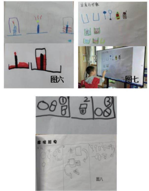 幼儿表征也是一种记录方式,用来表达自己的记忆、设想和感受,是把获得的经历在脑海中呈现出来的信息,然后用自己理解的图像或符号表达出来。最开始的时候,连我们老师也质疑:让孩子们来表征实验过程能做到吗?但是,当孩子们表征出自己的所见所做之后,老师们都惊呆了,直呼:老师也做不到啊,都是天才的孩子们。例如:水钻进瓶子里(图六)、密度与扩散(图七)等等。孩子们不但能用自己的方式表征出来,还能大胆地去表诉自己实验的过程及实验结果。有的孩子在表征过程中,还能标注出实验步骤,第一步做了什么,第二步做了什么,有的孩子用数字表示,有的孩子能用箭头来表示(图八)。