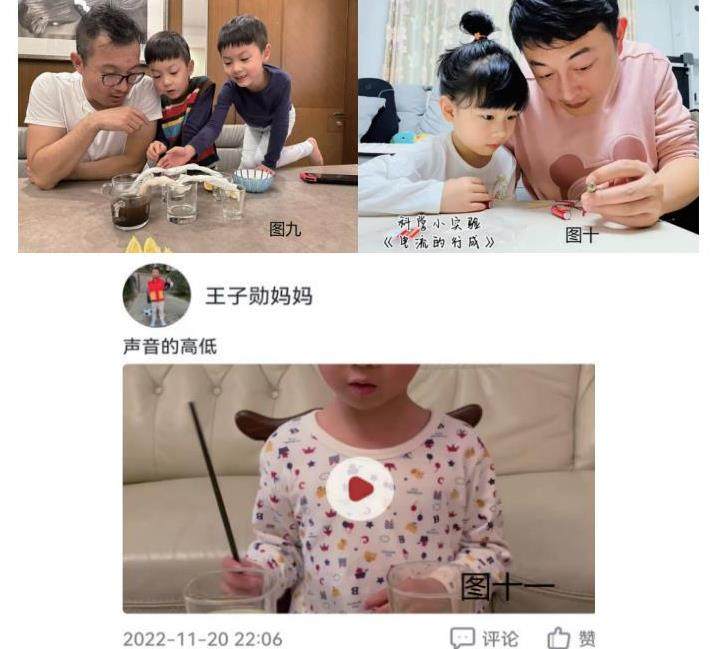 家长工作是幼儿园工作中不可忽视的阵地。自从幼儿园开展课题研究以来,得到家长大力支持与配合,很多家长积极主动买来科学类的书籍,带着孩子在家做各类小实验,周六日的亲子时光都成了亲子实验互动时间,不但孩子们感兴趣,家长也乐此不疲,和孩子们一起弄明白了很多常见的但又模糊不清的科学道理。比如:清洁生水(图九)、电流的形成(图十)、声音的产生和共鸣、自制洗手液、自制泡泡水等等,而且每天都有家长在朋友圈里都晒出亲子实验视频或照片(图十一),来炫耀家长和孩子之间的高光时刻。