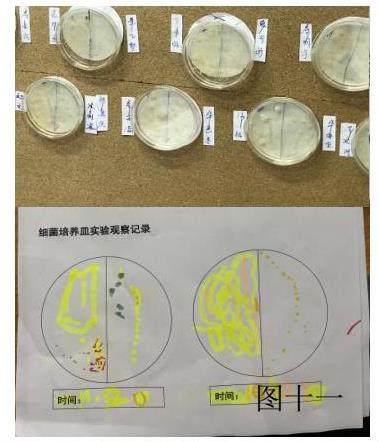 还有的家长利用在科研部门的工作之便,给孩子们带来细菌培养基,于是让老师们充分地利用这个机会:让孩子们在培养基里一半用没洗过的脏脏小手摸一模,另一半用洗过的干净小手摸一摸,观察培养基的变化并请孩子们记录下来(图十一)。经过十几天的变化,很明显用脏手摸过的一半,早早就生出了细菌,而用干净小手摸过的一半细菌会少很多。经过这个实验,老师再也不用每次洗手的时候去提醒孩子们了,孩子们洗手的次数明显增多,而且洗手的时候会非常认真地用洗手液反复搓洗,正是应了那句话“事实胜于雄辩”。