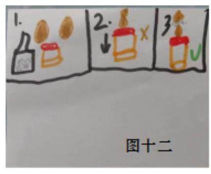 每个科学实验都不可能一次成功,因为一些小的失误实验有可能会前功尽弃,但是孩子们从来不会放弃,一遍一遍地尝试,有的孩子在表征中,用打叉的方式记录了自己实验失败的过程(图十二)。而孩子们并不怕失败,并坚信自己能成功,直到实验成功后,孩子们获得的成就感和喜悦时不言而喻的。因此,孩子们身上的这种坚持不懈的品质,在科学实验活动中得到更好的发扬,这种坚持的品质甚至值得我们成人去学习。
