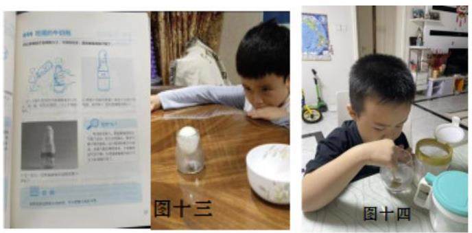 专注力是学习能力中非常重要的品质之一,是一种稳定的持续的心理状态,包含了意志自控品质在里面。孩子们因为喜欢实验而愿意做实验,而实验又需要专注才能更好地完成,因此科学实验的开展,培养了孩子们专注的品质,有的孩子在家为了观察实验的结果,甚至可以专注地观察、摆弄一个小时之久。如:“吃蛋的牛奶瓶”这个实验,鸡蛋一点一点进到奶瓶里需要一段时间,有的孩子能一动不动地观察40多分钟(图十三)。还有的孩子回家做盐的饱和实验,又突发异想,饱和的盐水里不能加盐,那能不能加糖呢。于是,自己不停地尝试往水杯里一会加盐一会加糖一会加水,忙活的不亦乐乎,竟然专注地摆弄了一个小时的时间(图十四)。
