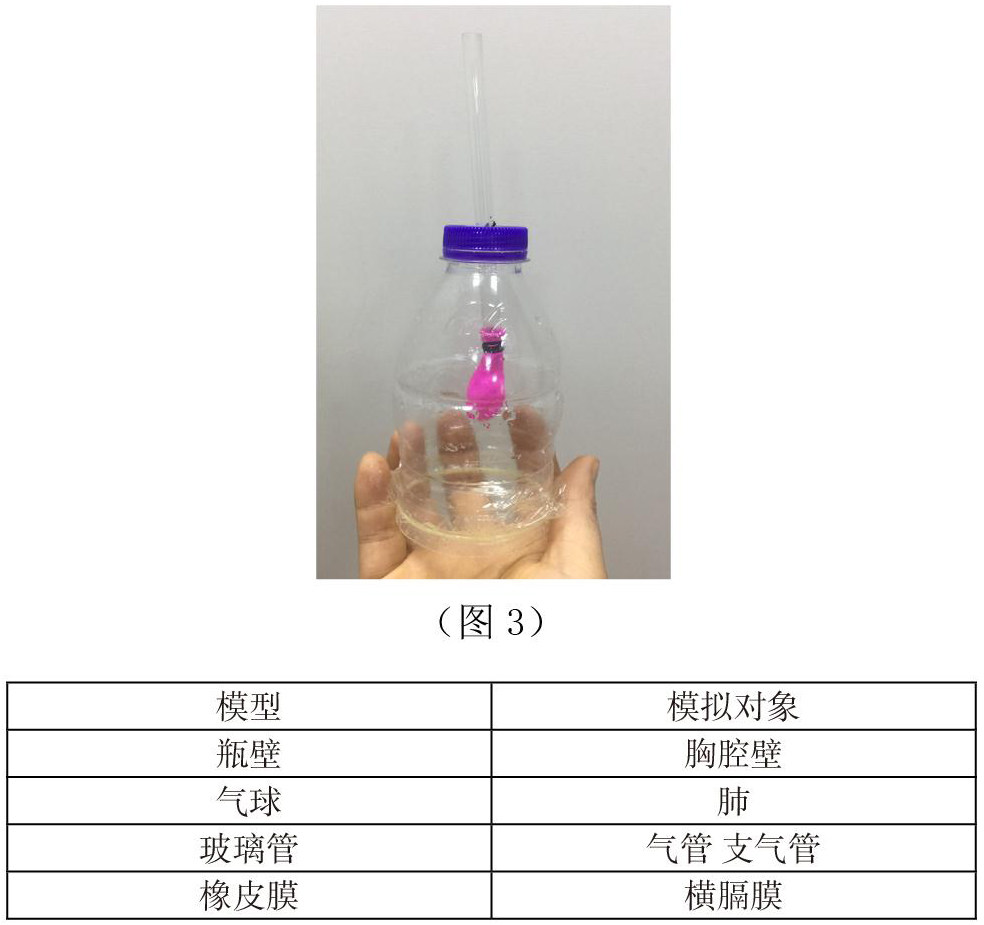 设置深呼吸体验活动,帮助学生认识肋骨、胸廓的运动。提出问题:我们是如何吸气、呼气的呢?引导学生思考,如果能有一个像黑板上的实物模型,这样就可以帮助我们更好认识这个过程。提供制作材料:橡皮膜、矿泉水瓶、玻璃管、橡皮筋等材料。引导学生利教师提供的材料,按照黑板上的设计,制作实物模型(如图 3)。通过表格对比,这些材料分别对应的是人体的哪些结构?