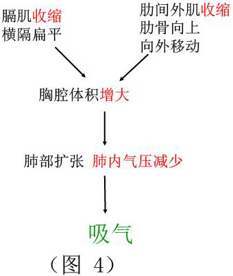 通过讨论,学生明白在实验中是用外力改变塑料瓶内气体体积,但在真实呼吸运动中,我们是如何改变胸腔内气体体积呢?对照物理模型,学生很容易想到膈肌和肋间肌的收缩和舒张,产生了使肋骨和胸廓运动的动力。通过流程图,展示呼吸运动过程。